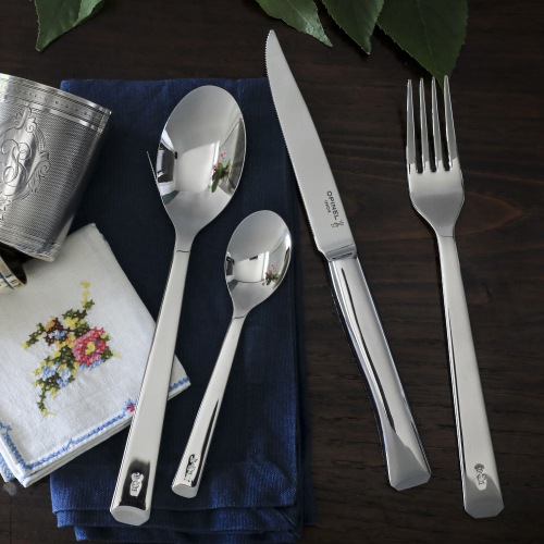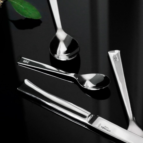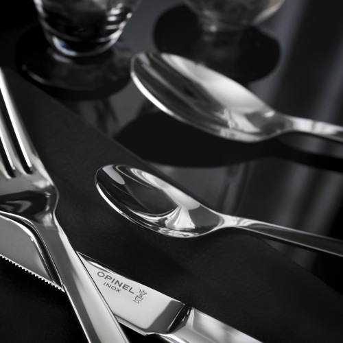 OPINELの代名詞である「折りたたみ」と「木製ハンドル」をあえて無くしたデザイン。オールステンレスにすることで、手入れが簡単で日常使いしやすいカトラリーになっています。ハンドルはやわらかい曲線形で手になじみます。王冠と手のマークがワンポイントで刻印されているのも新鮮です。