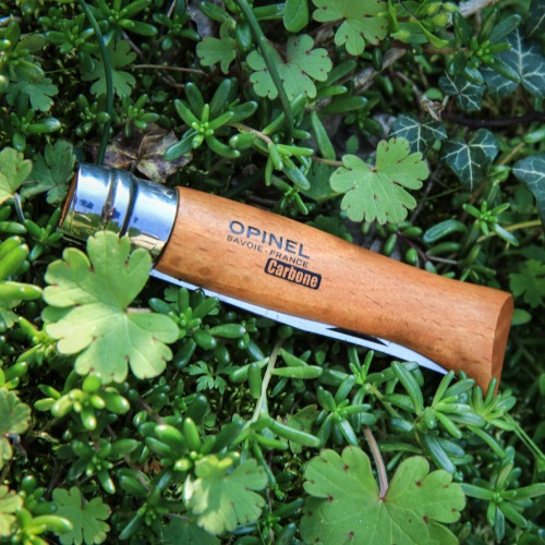 ハンドルには、フランス産のブナ材を使用しています。木目が細かく均質で強度に優れているため、オピネルのハンドルに最もよく使われている木材です。また「OPINELのロゴ」と「SAVOIE-FRANCE」の文字が記され、湿気や汚れから保護するために透明のニスを塗布して仕上げられています。