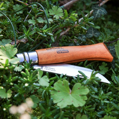 刃の鋼材は、カーボンスチールXC90で、炭素含有量は0.9%です。カーボンスチールの魅力は切れ味がよく研ぎやすいこと。ただし、硬いものを切ると刃が欠けやすくなるので注意が必要です。また、錆びやすい性質があるため、こまめなお手入れがかかせません。柔らかな曲線を描く刃には、開きやすくするためのタブと、「OPINELのロゴ」「王冠を戴く手」と共に「CARBONE」の文字が刻印されています。