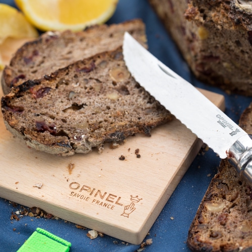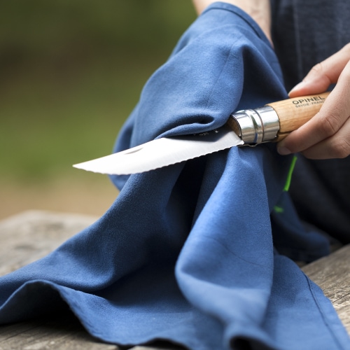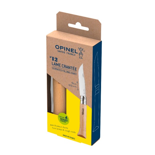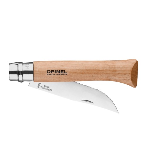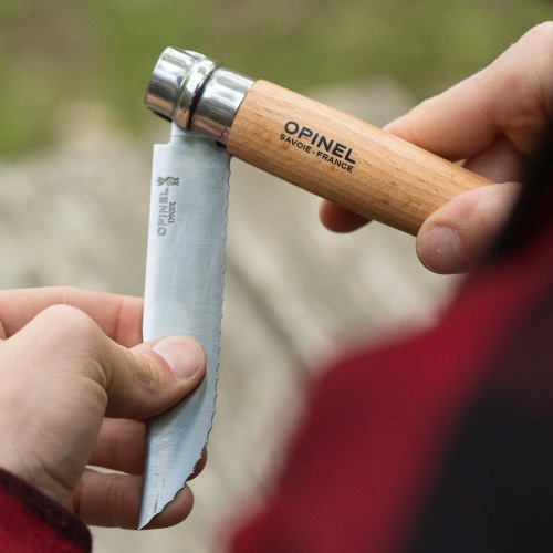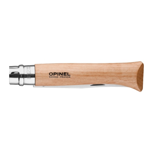 ハンドルには、フランス産のブナ材を使用しています。木目が細かく均質で強度に優れているため、オピネルのハンドルに最もよく使われている木材です。また「OPINELのロゴ」と「SAVOIE-FRANCE」の文字が記され、湿気や汚れから保護するために透明のニスを塗布して仕上げられています。