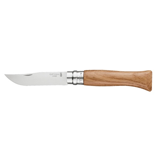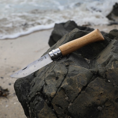 刃の鋼材には、実用硬度HRC55~57のステンレススチールを使用しています。錆びにくさとメンテナンスの容易さには定評があります。柔らかな曲線を描く刃には、開きやすくするためのタブと、「OPINELのロゴ」「王冠を戴く手」と共にステンレスを意味する「INOX」の文字が刻印されています。