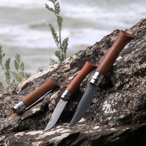 刃の鋼材には、実用硬度HRC55~57のステンレススチールを使用しています。錆びにくさとメンテナンスの容易さには定評があります。柔らかな曲線を描く刃には、開きやすくするためのタブと、「OPINELのロゴ」「王冠を戴く手」と共にステンレスを意味する「INOX」の文字が刻印されています。