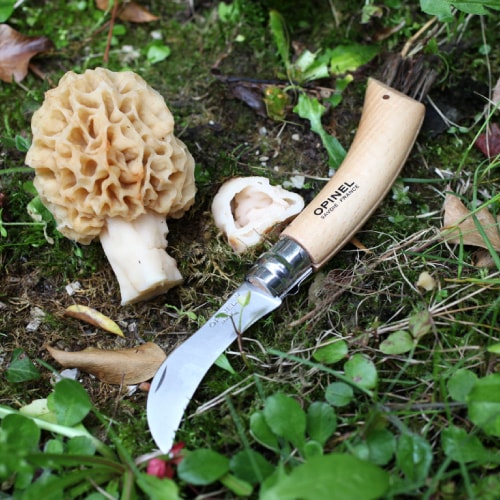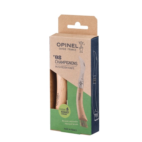 ハンドルには、フランス産のブナ材を使用しています。木目が細かく均質で、強度に優れているため、オピネルのハンドルに最もよく使われている木材です。ハンドル底部には、猪の天然毛でつくられた埃取りが付いており、キノコを傷付けずに枯れ葉の屑や埃などを取り除くことができます。ハンドルには「OPINELのロゴ」と「SAVOIE-FRANCE」の文字が記され、湿気や汚れから保護するために透明のニスを塗布して仕上げられています。