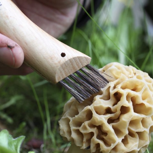 石突きがカットしやすいカーブした刃を備えたマッシュルームナイフ。刃の背には、キノコに付着した土や、傷んでしまった虫食い箇所を取り除くのに便利なマイクロ波刃が装備されています。ハンドル底面には、猪の天然毛でつくられた埃取りが付いており、キノコを傷付けずに枯れ葉の屑や埃などを取り除くことができます。