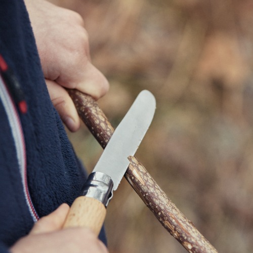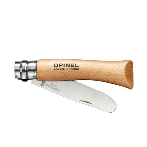 ハンドルには、フランス産のブナ材を使用しています。木目が細かく均質で強度に優れているため、オピネルのハンドルに最もよく使われている木材です。また「OPINELのロゴ」と「SAVOIE-FRANCE」の文字が記され、湿気や汚れから保護するために透明のニスを塗布して仕上げられています。
