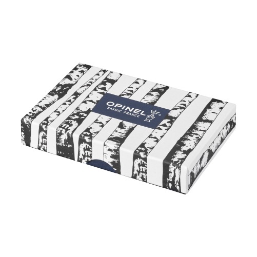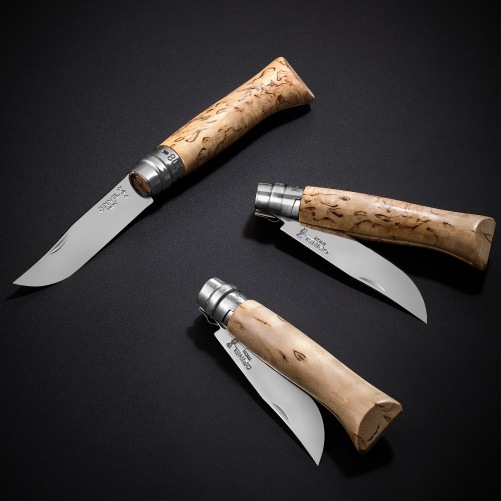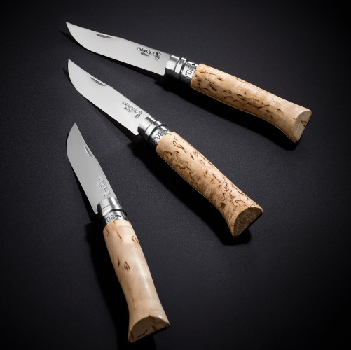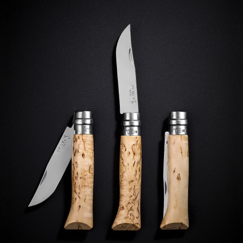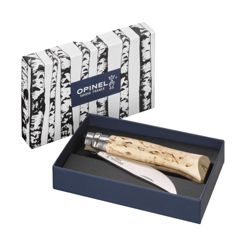 ステンレススチールNo.08 SAMPOのハンドルには、フィンランドの森で育ったカーリーバーチが使用されています。カーリーバーチとは、ヨーロッパの限られた地域にのみ自生する白樺の一種で、木製大理石とも称される波打つような美しい木目が特徴です。硬く耐久性に優れているため、船舶や高級車の室内装飾に使用されることも。鏡面仕上げの刃には、切れ味の鋭いサンドビック社の12C27Mステンレススチールを採用。刃身には「OPINELロゴ」や「王冠を頂く手」とともにステンレスを表すINOXの文字が刻まれています。専用の化粧箱入りなので、ギフトにもおすすめ。全世界で6,750本の限定生産となります。