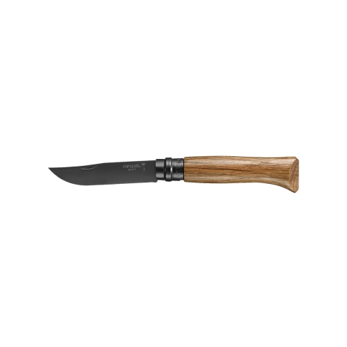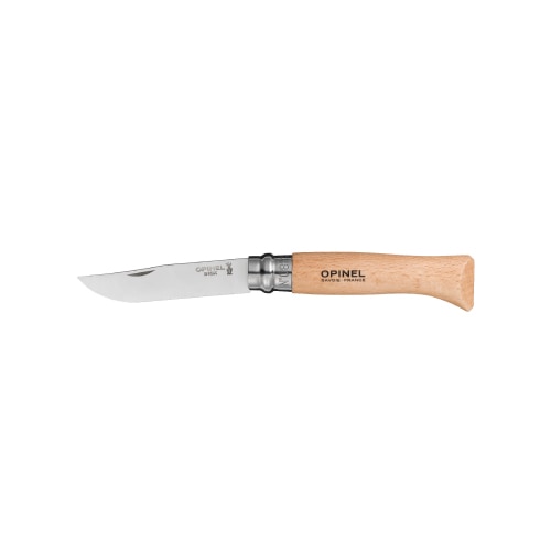 刃の鋼材には、実用硬度HRC55~57のステンレススチールを使用しています。錆びにくさとメンテナンスの容易さには定評があります。柔らかな曲線を描く刃には、開きやすくするためのタブと、「OPINELのロゴ」「王冠を戴く手」と共にステンレスを意味する「INOX」の文字が刻印されています。