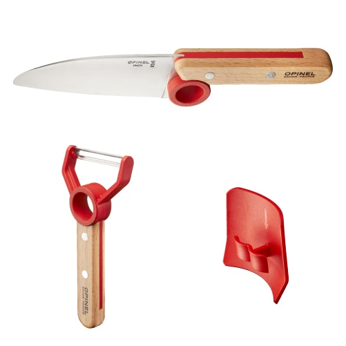 シェフナイフとピーラーは、リングに指を入れることで、握力の弱いお子さまでもしっかりとハンドルを握ることができます。ナイフの刃先は、安全に考慮して丸く作られています。