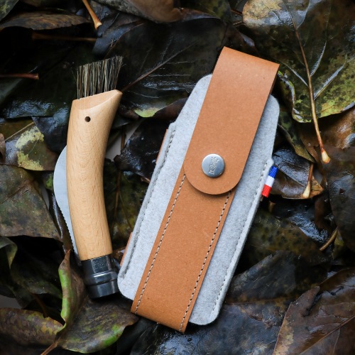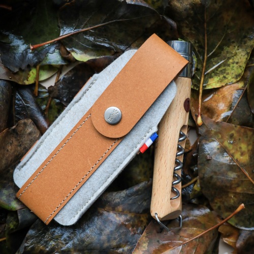 OPINELの折りたたみナイフNo.09/10、マッシュルームナイフNo.08に適合したナイフケース。廃革繊維を加工したリサイクルレザーと、ペットボトルをリサイクルしたR-PETフェルトを組み合わせて作られています。スイスのデザインスタジオ「BIG-GAME」と共同開発した、Collection Franceシリーズのひとつです。