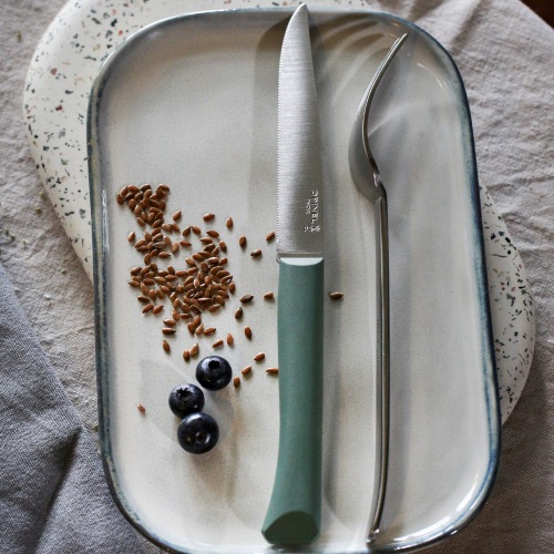 刃の鋼材には、実用硬度HRC55~57のステンレススチールを使用しています。錆びにくさとメンテナンスの容易さには定評があります。刃身には「OPINELのロゴ」「王冠を戴く手」と共にステンレスを意味する「INOX」の文字が刻印されています。