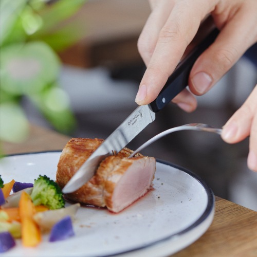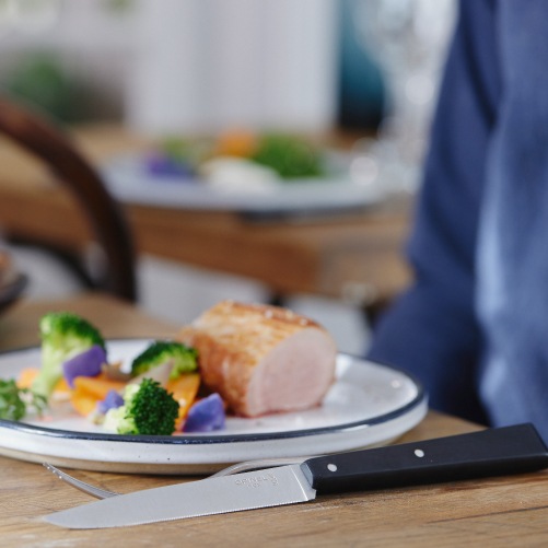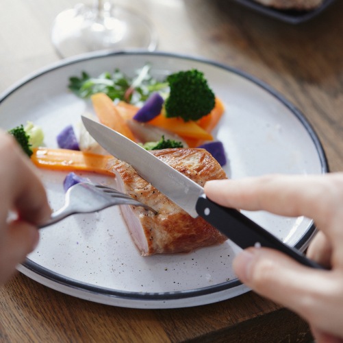 ボナペティ!テーブルナイフNo.125が、耐水性、耐薬品性、耐熱性に優れたポリマー樹脂製のハンドルに。刃にはマイクロセレーション(ギザ刃)加工が施され、研がずとも滑らかな切れ味が長持ちします。食器洗浄機対応なので、日常使いに最適です。