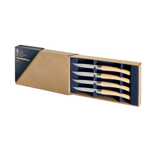 Table Chicシリーズは、洗練されたクラシックデザインのテーブルナイフ4本セット。手に馴染む流線形のハンドルと、トルコの剣にインスパイアされたヤタガン型の刃が特徴です。刃は、錆びにくくメンテナンスの手間がかからないステンレススチール製で、日常使いに最適。ビロブロックヒントを得たボルスター(ハンドルと刃の間のリング部)は、一部が平らな形状になっており、テーブルに置いた時に転がりにくいのがポイントです。