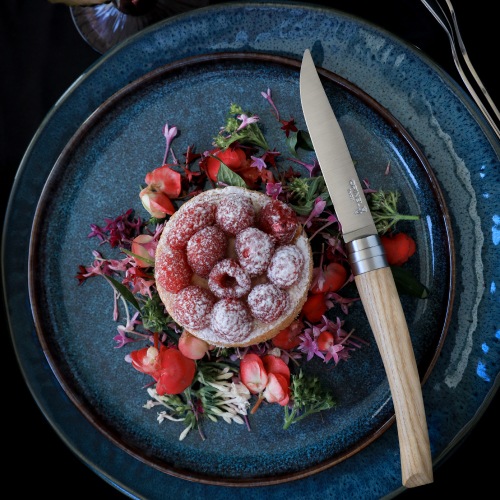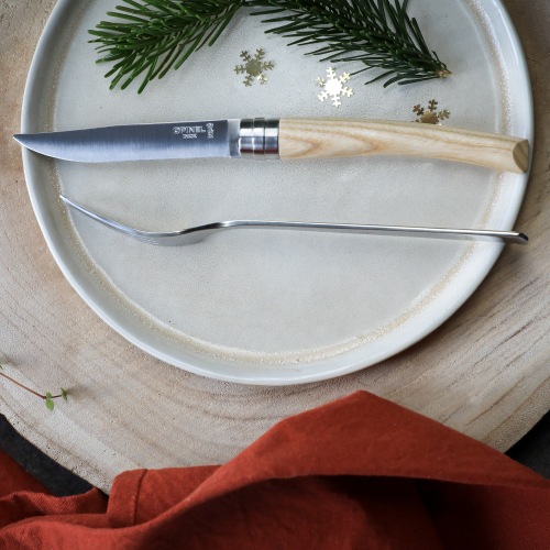 刃の鋼材には、実用硬度HRC55~57のステンレススチールを使用しています。錆びにくさとメンテナンスの容易さには定評があります。刃身には「OPINELのロゴ」「王冠を戴く手」と共にステンレスを意味する「INOX」の文字が刻印されています。