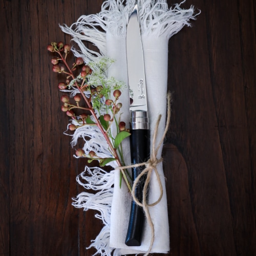 刃の鋼材には、実用硬度HRC55~57のステンレススチールを使用しています。錆びにくさとメンテナンスの容易さには定評があります。刃身には「OPINELのロゴ」「王冠を戴く手」と共にステンレスを意味する「INOX」の文字が刻印されています。
