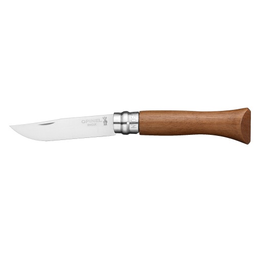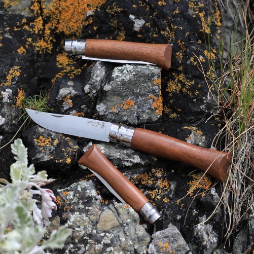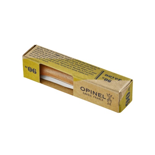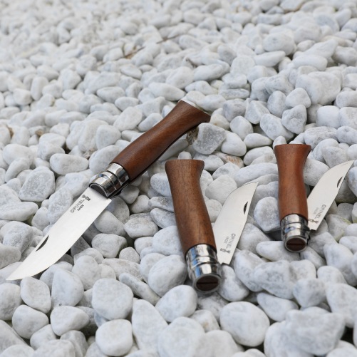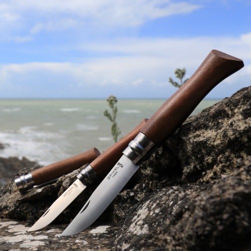 刃の鋼材には、実用硬度HRC55~57のステンレススチールを使用しています。錆びにくさとメンテナンスの容易さには定評があります。柔らかな曲線を描く刃には、開きやすくするためのタブと、「OPINELのロゴ」「王冠を戴く手」と共にステンレスを意味する「INOX」の文字が刻印されています。
