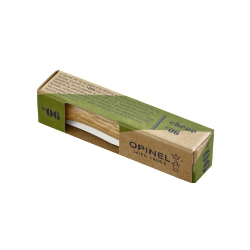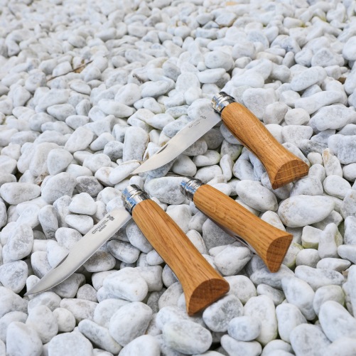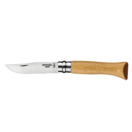 刃の鋼材には、実用硬度HRC55~57のステンレススチールを使用しています。錆びにくさとメンテナンスの容易さには定評があります。柔らかな曲線を描く刃には、開きやすくするためのタブと、「OPINELのロゴ」「王冠を戴く手」と共にステンレスを意味する「INOX」の文字が刻印されています。