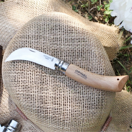 ハンドルの一部には、フランス産のブナ材を使用しています。木目が細かく均質で強度に優れているため、オピネルのハンドルに最も良く使われている木材です。湿気や汚れから保護するために透明のニスを塗布して仕上げられています。